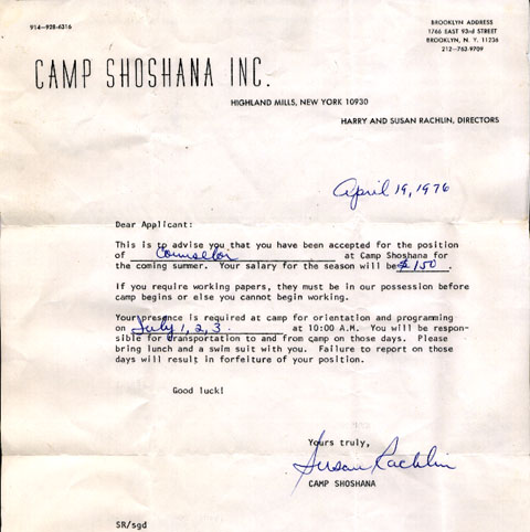 From:Steven Kolodny - sgkolodny@aol.com Steven Kolodny writes: I came across my counselor contract for the summer of 1976. I had all that fun and I was paid too?! Click Here. Amazing. --Steve